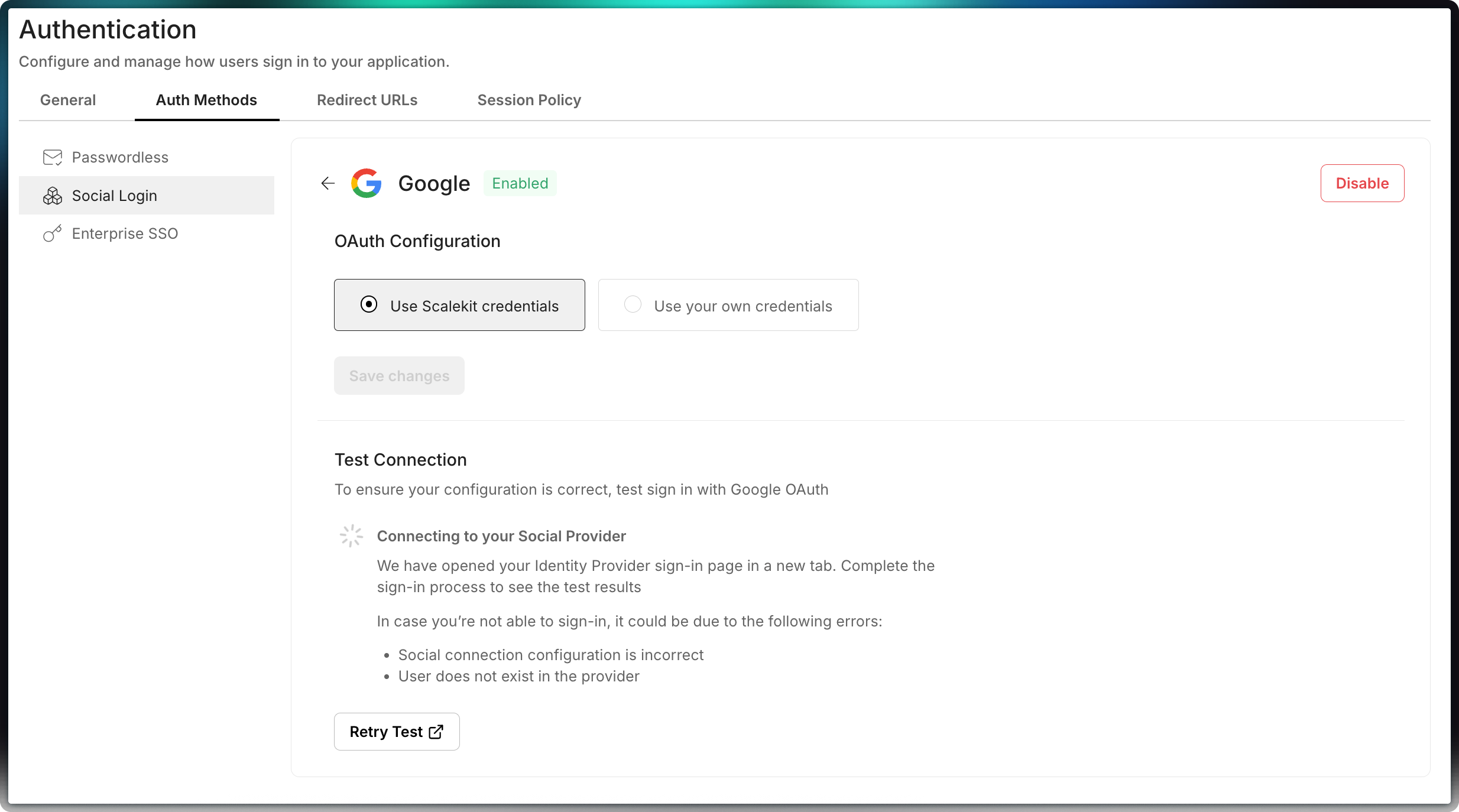 Section titled “Configure social login providers”Google login is pre-configured in all development environments for simplified testing. You can integrate additional social login providers by setting up your own connection credentials with each provider.