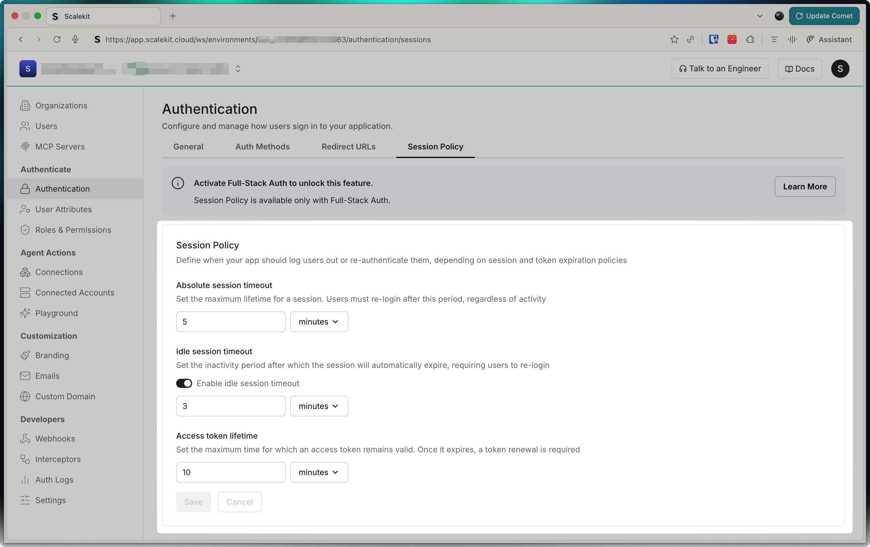 In your Scalekit dashboard, the Session settings page lets you set these options: