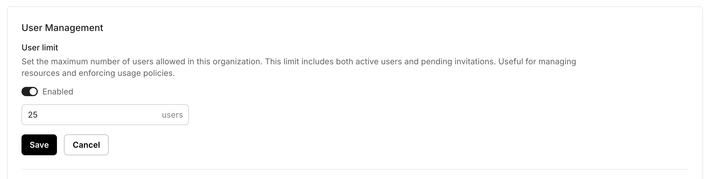 Section titled “Limit user sign-ups in an organization”Use this when you need seat caps per organization—for example, when organizations map to departments or when plans include per‑org seat limits.
