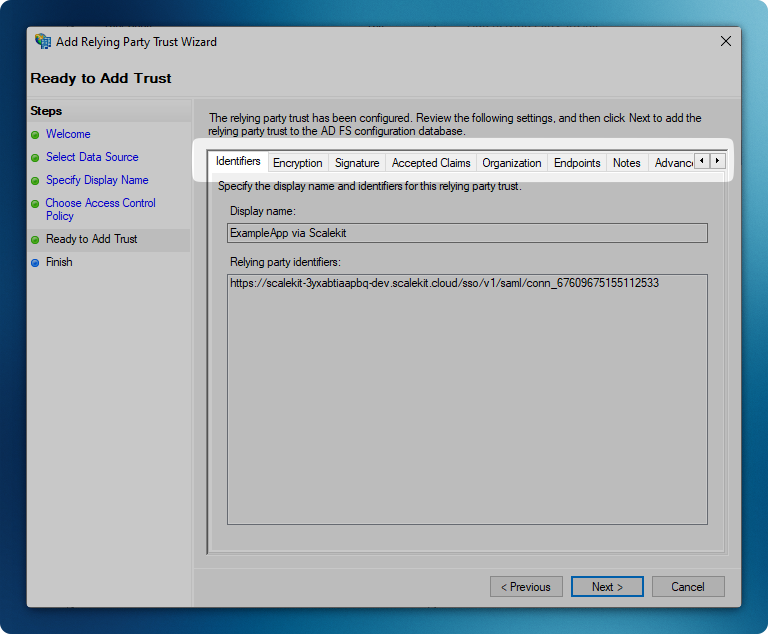The wizard will complete with the ‘Edit Claim Issuance Policy’ option automatically selected